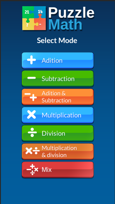 In puzzle math you can choose what kind of operations you want to practice:
