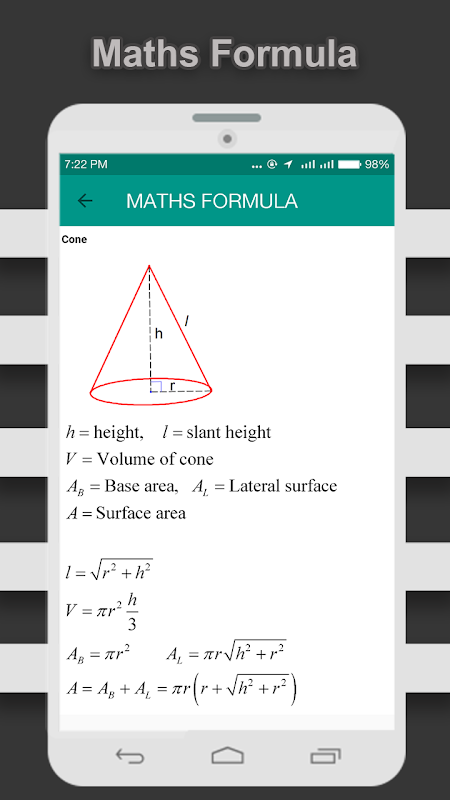 ALL Maths Formulas covers each and every math formulas like Algebra formulas,Geometry formulas, Analytical Geometry formulas, Derivation formulas, Integration formulas, Trigonometry formulas, Laplace transform formulas, Probability formulas, that will help all students & specially those who are preparing for competitive exams. .