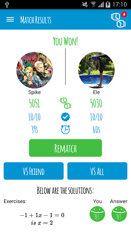 Maths Match introduces a new way to improve the Maths skills: making you the one who, for once, corrects other people's mistakes while taking off the pressure of being in the spotlight.