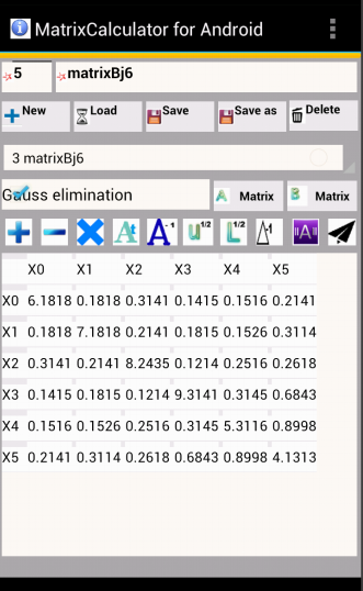 The application is designed to entering, storing and processing matrices. Direct matrices operations are: - sum; - subtract; - multiplication; - inversion (by the method of Gauss and the method of the square root); inversion of triangular matrix; .- multiplication of matrix by vector; - transposition; - multiplication of the vectors; - calculating - a determinant, trace and norm. The application allows to run a chain of successive operations on matrices and vectors