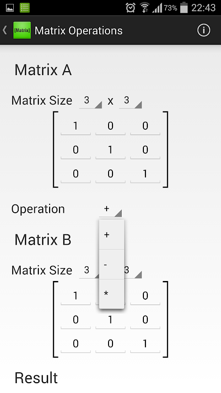 The Matrix Operations tool lets you do mathematical operations on matrices. You can add, multiply or substract matrices very easily.