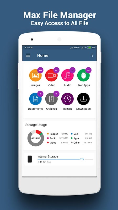Max File Manager and File explorer is easily Manage, share and transfer your files easily and efficiently with Max File Manager. Browser files easily categories by documents and data, images, videos, music, applications, downloaded, and favorites. Max File Explorer File Manager app helps to access your files and folders in quick and easy way.