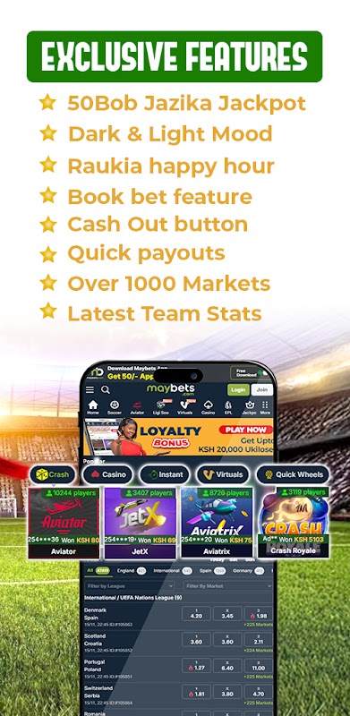 Bu gerçek parayla oynanan bir kumar uygulamasıdır. Kumar bağımlılığı konusunda yardım ve destek için lütfen 1199 numaralı telefondan Sorumlu Kumar Ücretsiz yardım hattımızla iletişime geçin veya https://responsiblegambling.or.ke/ adresini ziyaret edin.
