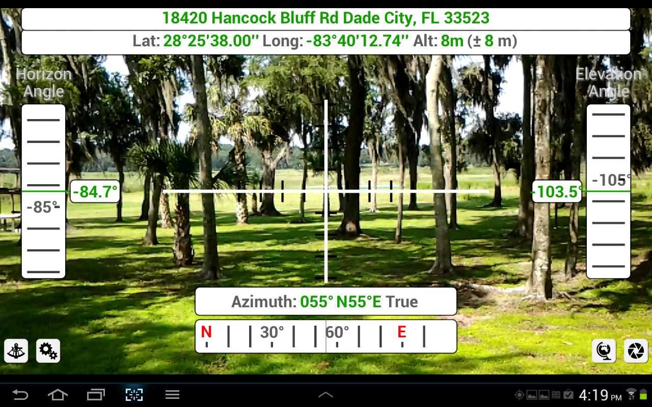 Our Measure Angle application functions similarly to the theodolite surveying instrument that has been used for generations while taking advantage of the tools on the smartphone or tablet (GPS, maps, inclinometer, camera, magnetometer, etc.). In addition, the longitude, latitude, altitude, azimuth, address (if available), date and time, and horizontal and vertical angles are overlayed onto the camera viewfinder in real time and recorded when a photograph is taken (if desired). The information is also recorded on a map including bearings, distances, and heights of objects measured. Although the tool is primarily used by geologists, archaeologists, engineers, surveyors, architects and other professionals, the device can be extremely handy for hikers and bikers, golfers trying to determine distances to holes, hunters, and travelers in boats and cars.