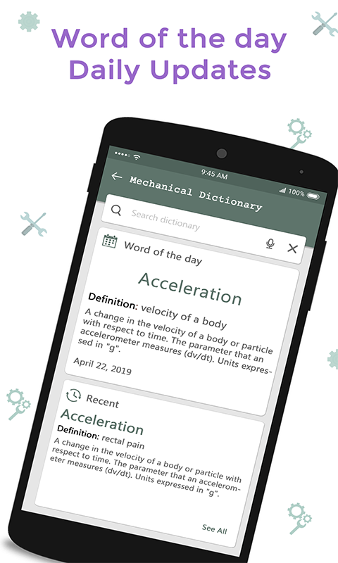 Bu “Mekanik Sözlük” uygulaması , Mekanik becerilerinizi geliştirmenize yardımcı olacak, böylece iyi konuşup etkili bir şekilde sunum yapabilmeniz için çoktan seçmeli bir soru (MCQ) kelime bulmaca içerir. Uygulamanın çekici bir kullanıcı arayüzü (UI) ve düz navigasyon kontrolleri vardır, böylece tüm özellikleri zahmetsizce kullanabilirsiniz.