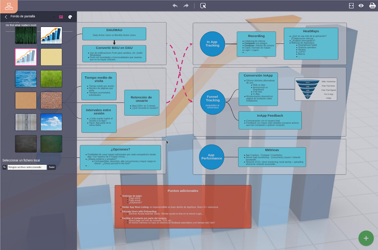 Con MentalMaps podrás plasmar tus ideas de una manera fácil y rápida, y permitir que otras personas colaboren en tiempo real. Además, todos los datos se guardan automáticamente, por lo que no tendrás que preocuparte de perder la información que añadas.