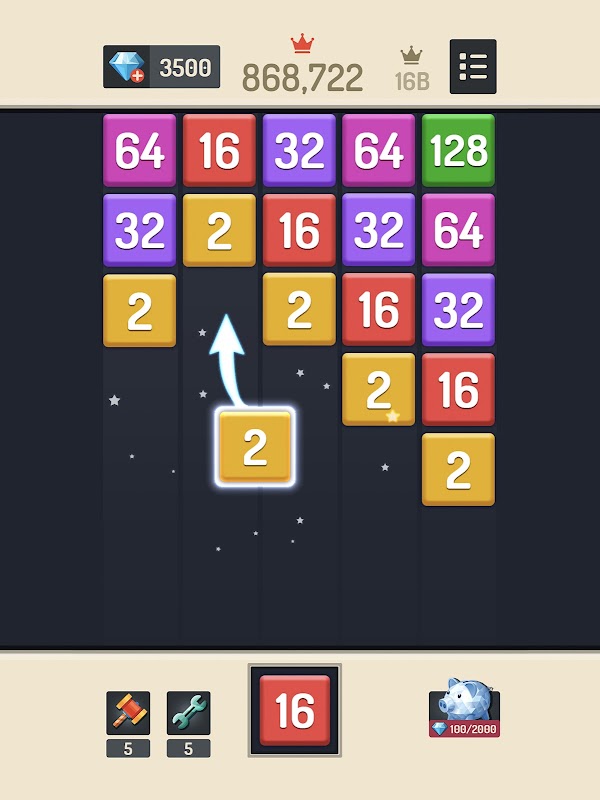 Dokun, sayıyı bırak ve x2 blokları birleştir.