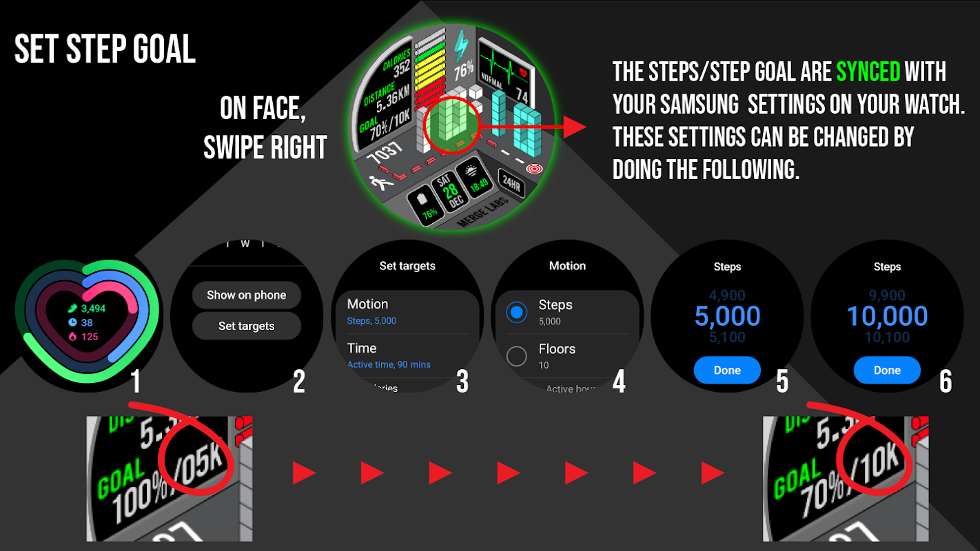 - Grafik göstergeli günlük adım sayacını görüntüler. Adım hedefi, Samsung Health Uygulaması veya varsayılan sağlık uygulaması aracılığıyla cihazınızla senkronize edilir. Grafik göstergesi senkronize adım hedefinizde duracaktır ancak gerçek sayısal adım sayacı 50.000 adıma kadar adımları saymaya devam edecektir. Adım hedefinizi ayarlamak/değiştirmek için lütfen açıklamadaki talimatlara (resim) bakın. Ayrıca adım sayısıyla birlikte yakılan kaloriler ve KM veya Mil cinsinden kat edilen mesafe de görüntülenir.