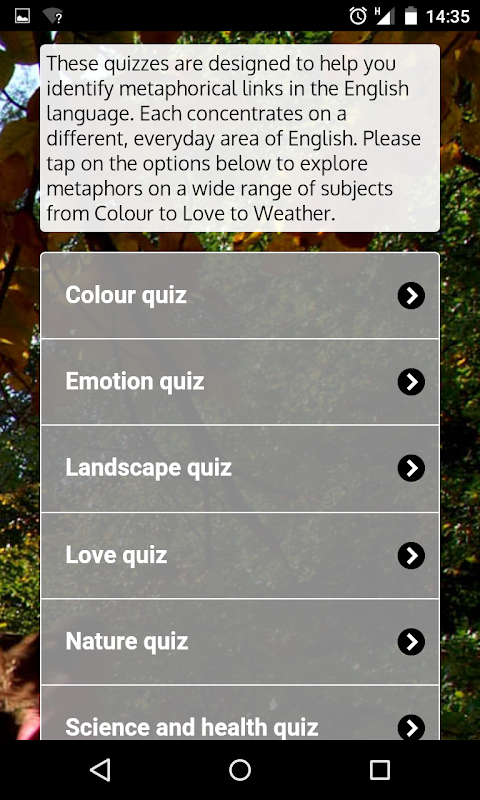 app 'Müfredat içinde Metafor' İngilizce dilinde metafor bilginizi artırmak için yardımcı olmak için interaktif araçlar sağlar. mecaz sınavlar ve İngilizce Metafor Haritası sürüm: iki ana app bileşeni vardır. Uygulamanın orta dereceli okullar ve uygulamanın özelliklerine online erişim için öğretim materyalleri içeren Müfredat web sitesinde Metafor, birlikte kullanılabilir.