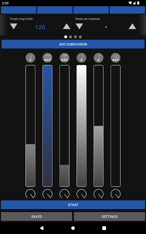 Alt bölümlerin nasıl oynatıldığı konusunda tam bir kontrol sağlayan tek metronom - herhangi bir tipte 10 altbölüm (5/7 gibi özel alt bölümler dahil) ekleyin ve bunları her zaman, rastgele aralıklarla veya sıralı bir şekilde oynatın.