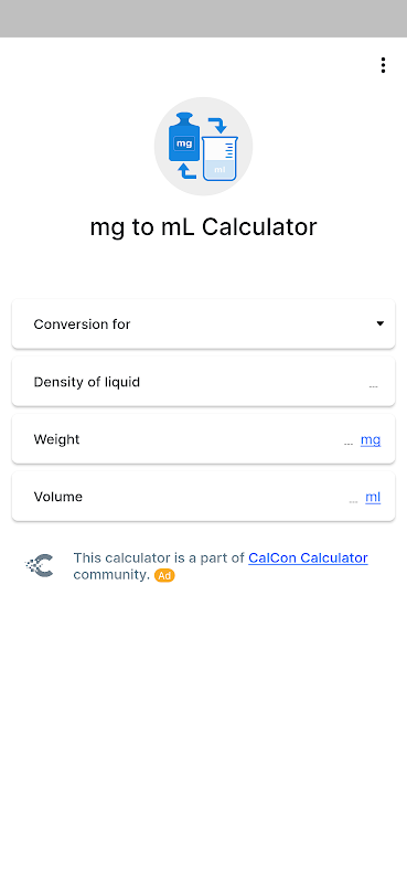 Miligramı mililitreye dönüştürürken, aksi takdirde sıvılar ve toplu içerik maddeleri (ilaçlar, kimyasal reaktifler) için bir işlevi yerine getirir. Ayrıca miligram sayısını mililitre sayısına dönüştürmek için miligramı maddenin yoğunluğu ile çarpın ve 1000'e bölün.