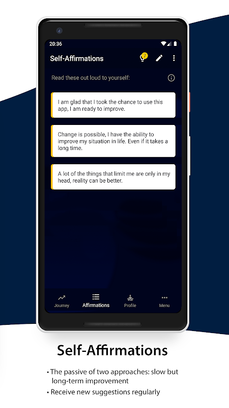 Güvenlik reddi: Bu uygulama, yalnızca kullanıcıyı geliştirmelerinde desteklemek içindir, ancak bunun çalışması için yanlarında içsel motivasyon getirmeleri gerekir. Uygulamanın bunu basit bir kullanımla yapabileceği iddia edilmemektedir. Geliştirici, profesyonel bir doktor veya psikiyatrist değildir; Ciddi sorunlarınız veya depresyonunuz varsa, lütfen bir profesyoneli ziyaret edin.