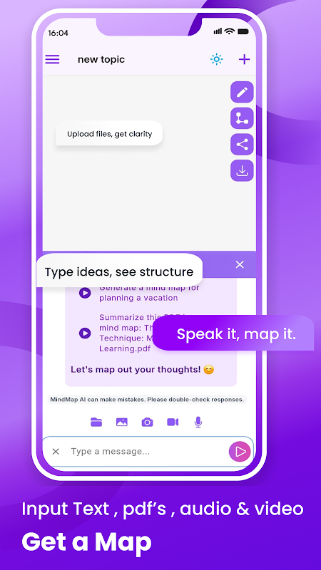 MindMap AI ile zahmetsizce yapılandırılmış görsel içerik oluşturmak için görselleri, PDF'leri, sesleri, videoları, CSV'leri ve düz metinleri yükleyin.