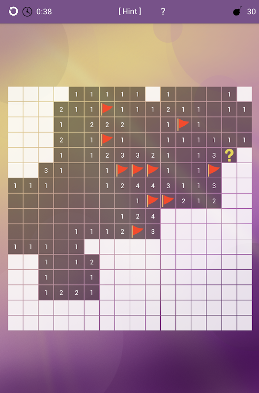 If you get stuck, press the hint button. The app will automatically check the flags that you’ve placed and tell you if you flagged a mine incorrectly. If all of your flags are correct, it will flag the location of a hidden mine for you.