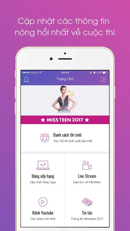 Ứng dụng Miss Teen Vietnam cung cấp đầy đủ thông tin cập nhật về thí sinh tham gia cuộc thi, bảng xếp hạng bình chọn, tính năng theo dõi thí sinh, xem livestream và bình chọn trực tiếp trên ứng dụng.