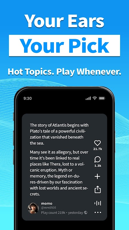 Kulakların için sosyal akış. Yaz, yapay zeka konuşsun. Viral sesli paylaşımlar.