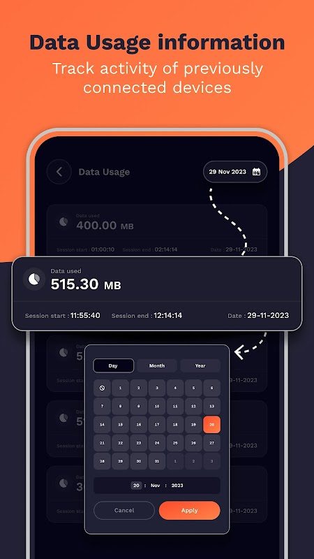 • Ayrıntılı Geçmiş: Her erişim noktası oturumu sırasında mobil veri kullanımınızın geçmişine erişin. Örneğin, erişim noktasını 18 Ocak 2024'te saat 13:00'te etkinleştirir ve saat 14:00'te devre dışı bırakırsanız, oturumun veri kullanımını (ör. 2,45 KB), başlangıç ve bitiş saatlerini ve oturum tarihini gösteren bir rapor alırsınız.