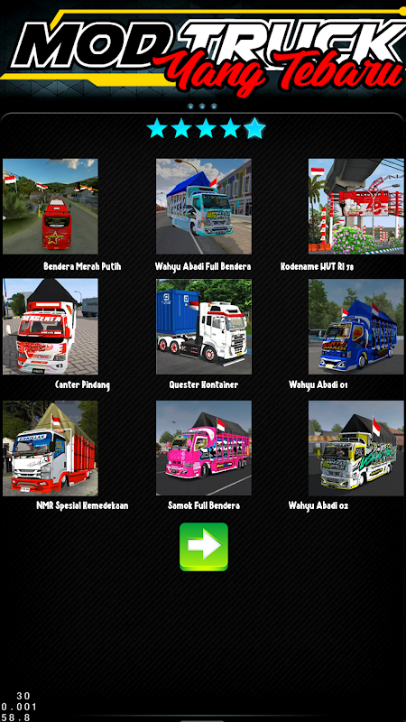 Bayraklı özel mod kamyonlar, yani kırmızı ve beyaz bayraklı kamyon modları, basit bussid truck canter modu ve çizgilerle dolu bussid truck modu dahil olmak üzere çeşitli yeni çıkan sallama modlu kamyonlarda mevcuttur. 78. Endonezya Bağımsızlık Günü hissi ile kırık yollarla tamamlanmış bussid modunu geçmek için eksiksiz mod otobüs simülatörüne Endonezya bayrağıyla kamyon modunu ekleyin.En son 2024 mod kamyon sürümünü karşılamak için tamamen eğimli bir kamyon modunu giyin.