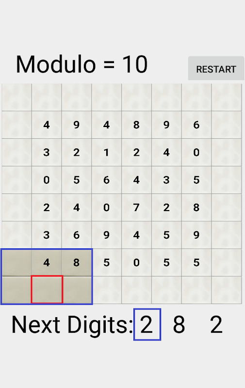 On clicking an empty tile once, the neighboring tiles are highlighted. If the modulus of sum of neighbors is equal to the incoming integer, then upon a second click, the neighboring tiles are cleared. Else, the integer is added at the tile.