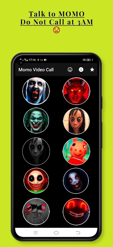 Korkunç Momo Görüntülü Çağrı Mücadelesi oyunu (momo ile görüntülü arama) ünlü hayalet ve Rahibe, Joker gibi en korkunç yaratıktan ses, ses, görüntü ve sohbet metni sohbeti ile gerçek görünen sahte bir sanal simülasyon ve atlama sahnesi (kalp çarpması) simüle eder balkabağı kostümü, Satan 666 ve Jeff the Killer ile.