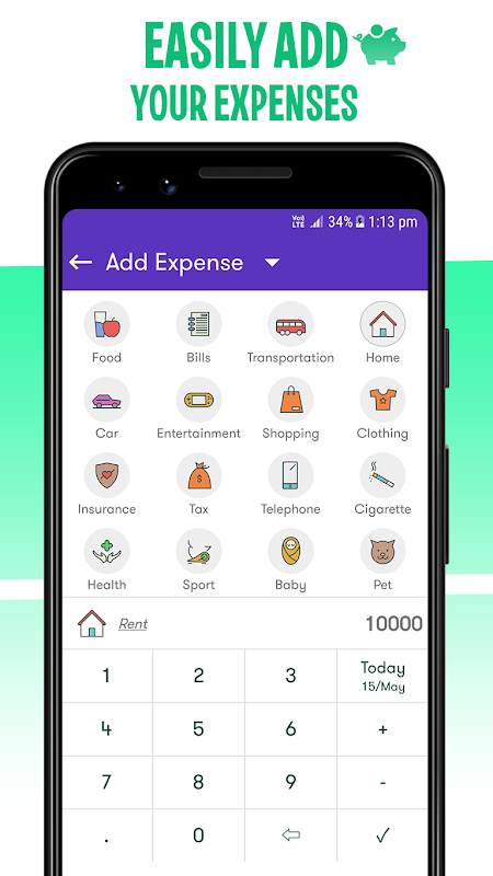 Money Manager'ı açtığınızda, yeni giderler ekleyebileceğiniz ve kaydedilenleri görebileceğiniz çalışma alanında başlar. Giderlerinizi / gelirlerinizi eklemek oldukça basittir. Sadece Ekle düğmesine basın ve sonra miktarı ekleyin. Her harcamaya belirli bir kategori verilebilir