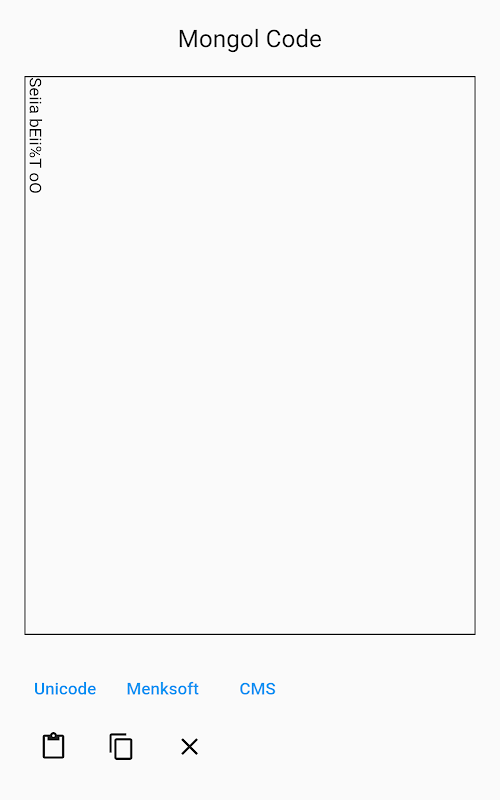Bu uygulama, Moğolca geleneksel komut dosyası için Unicode'u Menksoft koduna ve CMS koduna dönüştürür. Bu kodlar arasındaki farkı bilmiyorsanız, bu uygulama muhtemelen sizin için değildir.