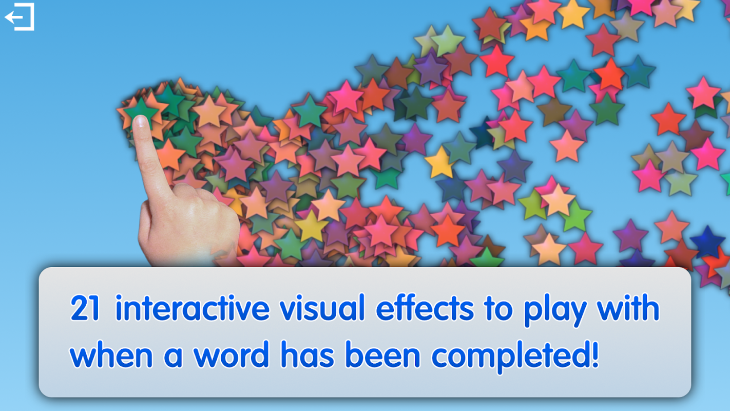 Bir kelime tamamlandığında 21 eğlenceli ve renkli etkileşimli görsel efekt görüntülenir. Görsel efektler, çocuğunuzun dokunuşunu takip ettikçe hareketlenir ve değişir.