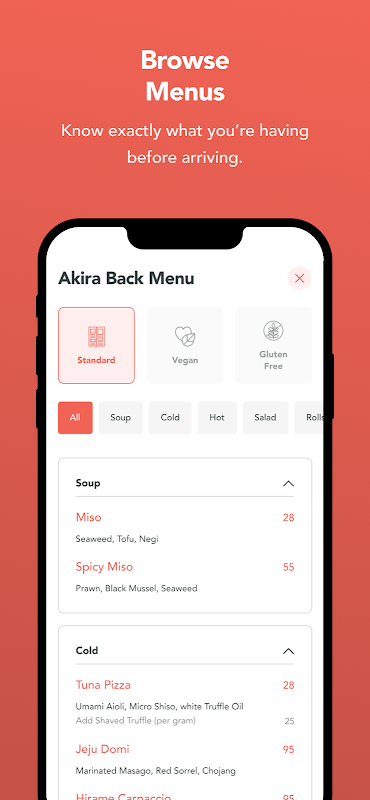 Sıradan kafelerden ünlü şef yemeklerine kadar, yakındaki seçenekleri arayın ve mutfağa, deneyime, diyete ve daha fazlasına göre filtreleyin. Neyi özlediğinizi bilmiyor musunuz? Yemek önerileri almak için telefonunuzu sallayın. Ayrıca, uygulamadan hiç çıkmadan menüleri görüntüleyin ve masa rezervasyonları yapın.