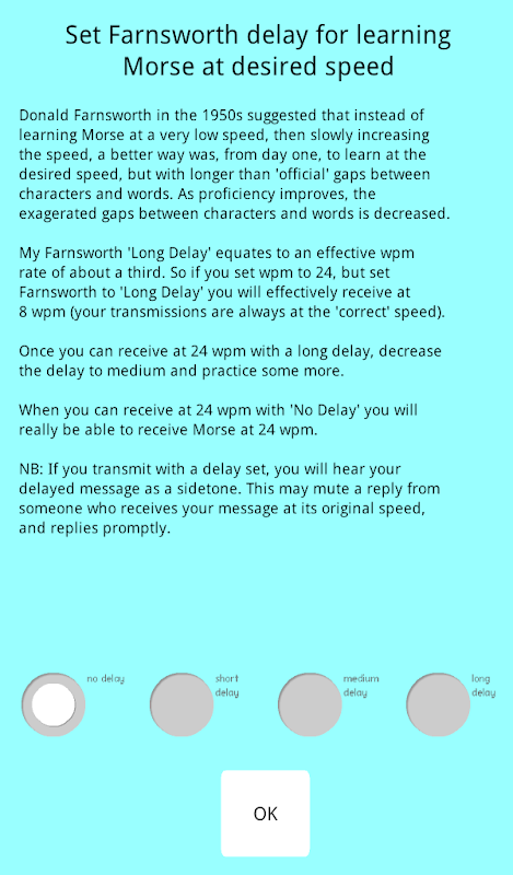 My app mimics a Morse transceiver that can send and receive perfect Morse on any of 20 channels, at a speed of 5 to 32 wpm. Receive sidetone can be set between 400 and 1000 Hz.