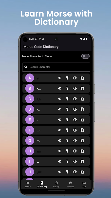 Ses, el feneri ve titreşim oynatma seçenekleriyle Mors alfabesini daha önce hiç olmadığı gibi deneyimleyin.