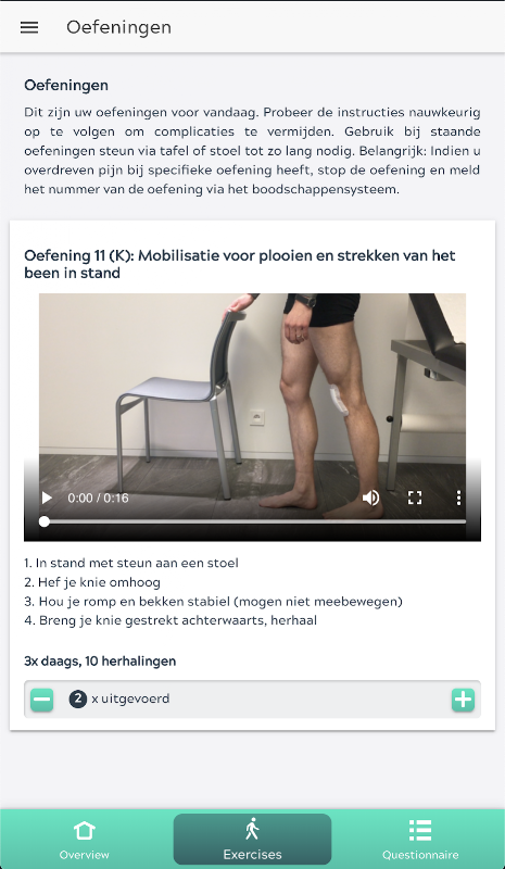 Tüm işlem boyunca - işleminizden önce ve sonra - gelişiminiz, moveUP uygulaması ve akıllı bilezik ile izlenecektir. Ayrıca, hafta sonu boyunca, dahili bir mesaj işlevi aracılığıyla bakım ekibinizle günlük iletişim halinde olabilirsiniz. Evde bağımsız olarak yaptığınız egzersizler, net talimatlar ve videolar aracılığıyla günlük olarak sunulur. Bunlar evriminize, kayıtlı faaliyetlerinize ve ağrı puanlarınıza göre ayarlanır.