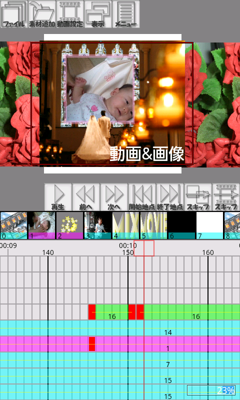 フレーム単位で自由に編集でき、写真と動画の組み合わせや、写真とエフェクトだけで動画を作ってみたりと、好きな動画を作りこむことができます。