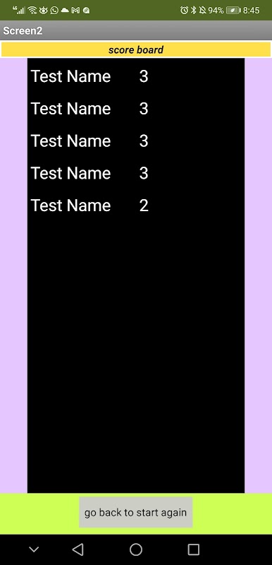 Kullanıcının adını yazacağı, soruları yanıtlayacağı ve göndereceği bir MQA uygulamasıdır. Gönderim yapıldıktan sonra, bu sınava giren kullanıcıların isimlerinin ve yanlarında puanlarının bulunduğu bir lider panosunun olacağı başka bir ekrana yönlendirilecekler.