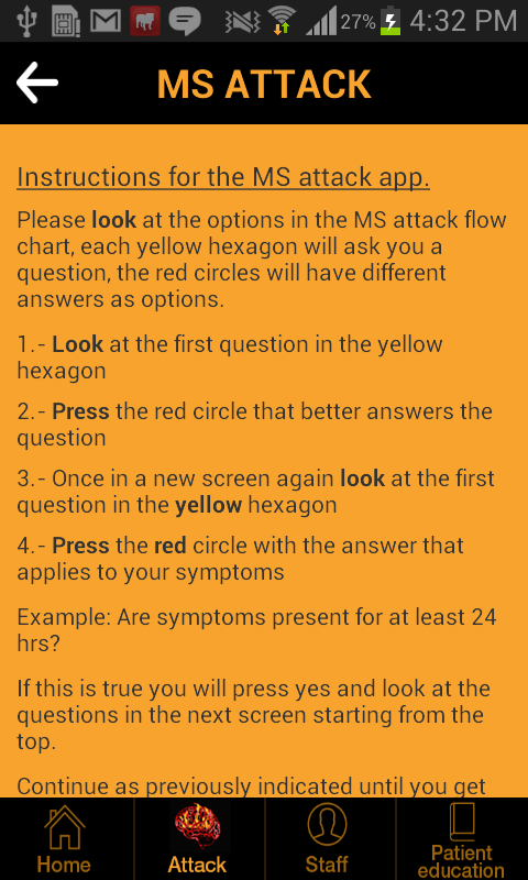 The most comprehensive MS Attack App in the market to aid multiple sclerosis patients learn about MS symptoms and how these symptoms may present during an MS attack.
