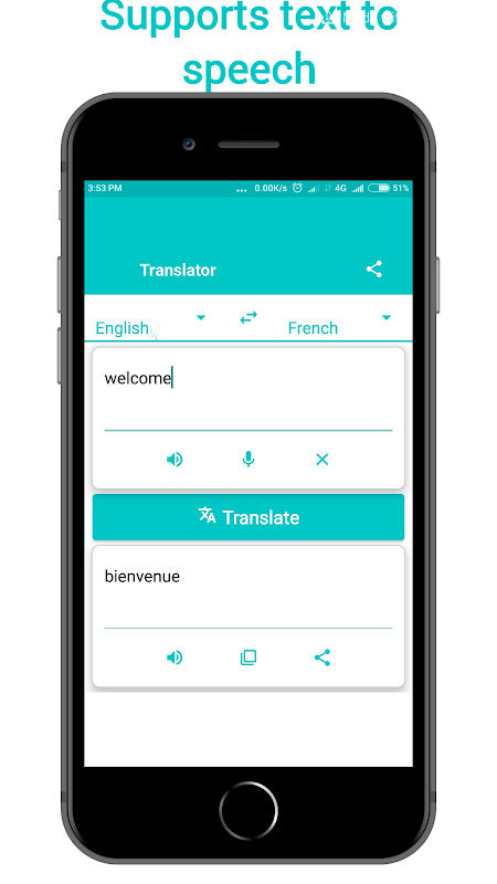 This Translator is the most powerful translation tool on your Android Device. Translate any sentence or phrase into any destination language, and enjoy a set of useful add-on features such as text-to-speech, and integrated social media support.
