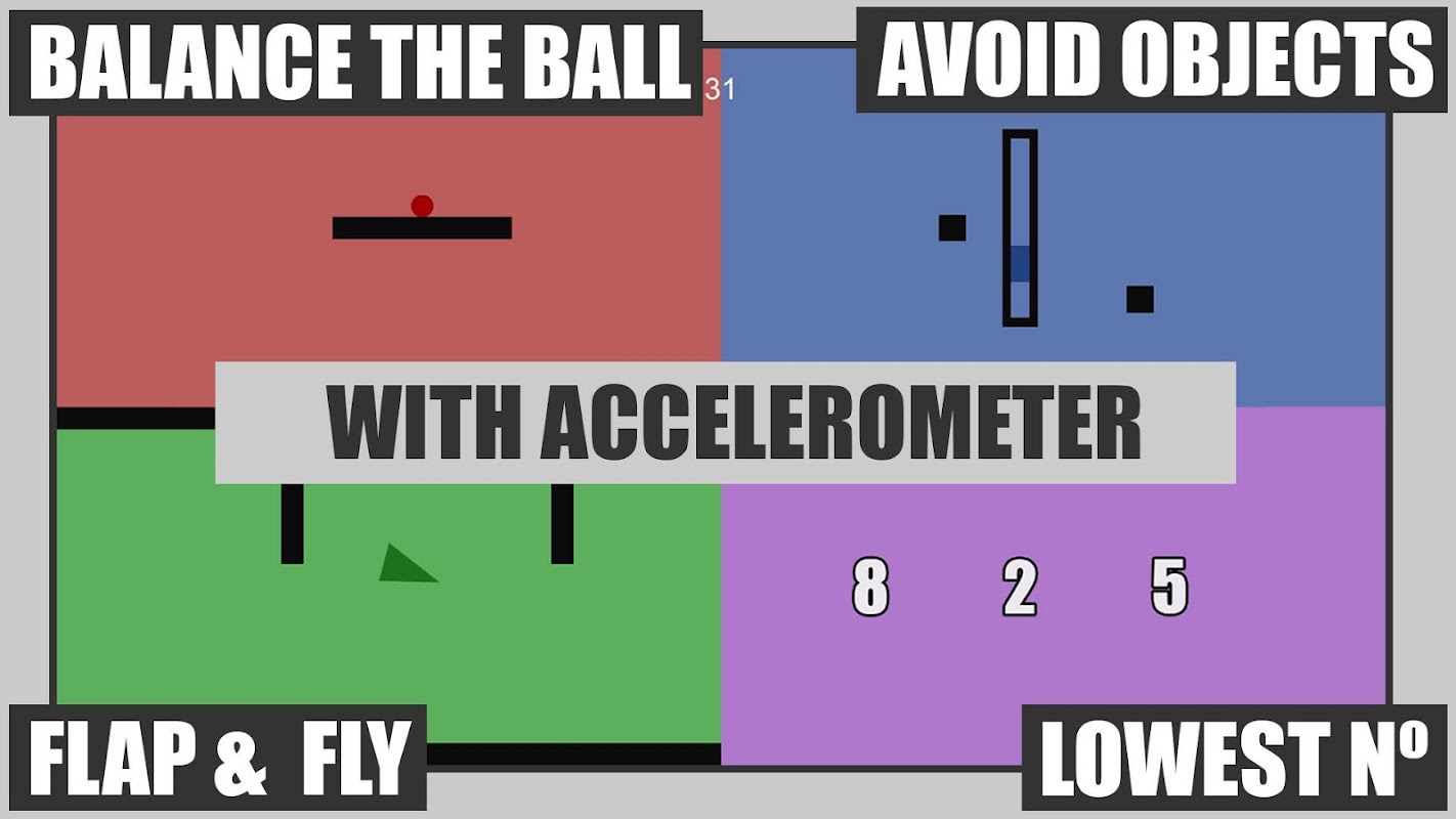 - Kırmızı top dengeleme: Cihazınızı sola ve sağa eğerek kırmızı topu çubukta dengeleyin. Topu platformun ortasında tutun ve düşmesine izin vermeyin (ivmeölçer olmadan oynanabilir). Kırmızı top yer çekimi fizik yasasını takip eder ve dikkatli olmazsanız ve dengeyi korursanız platformdan düşecektir!