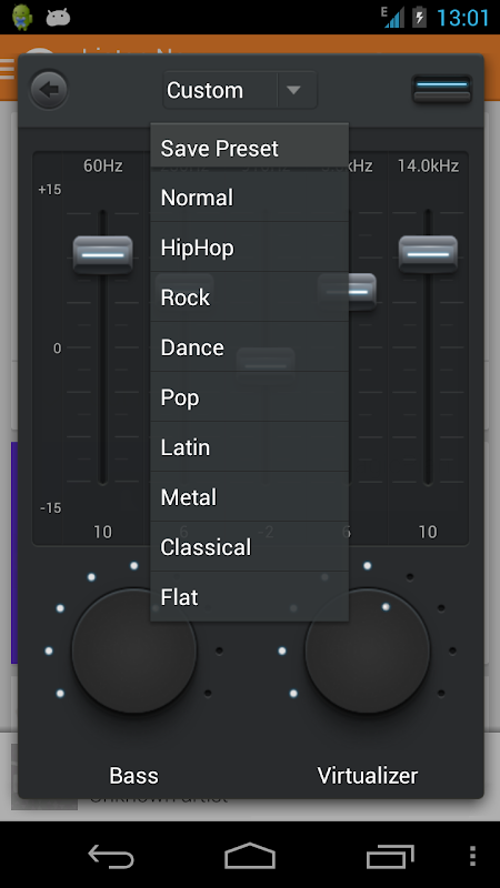 Music Equalizer is a volume slider with five band Equalizer with Bass Boost and Virtualizer effects.