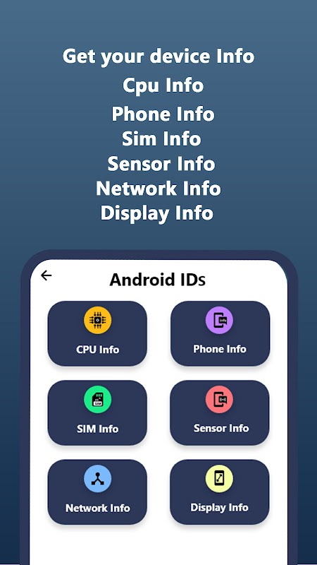 Ana kategoriler olarak Telefon Kimlikleri ve Cihaz Kimlikleri vardır. Cihaz kimliklerinin CPU Bilgisi, Telefon Bilgisi, SIM Bilgisi, Sensör Bilgisi, Ağ Bilgisi ve Ekran Bilgisi gibi alt kategorileri vardır. Bunların hepsi, belirli kategorilerinin kimliklerini gösterir.