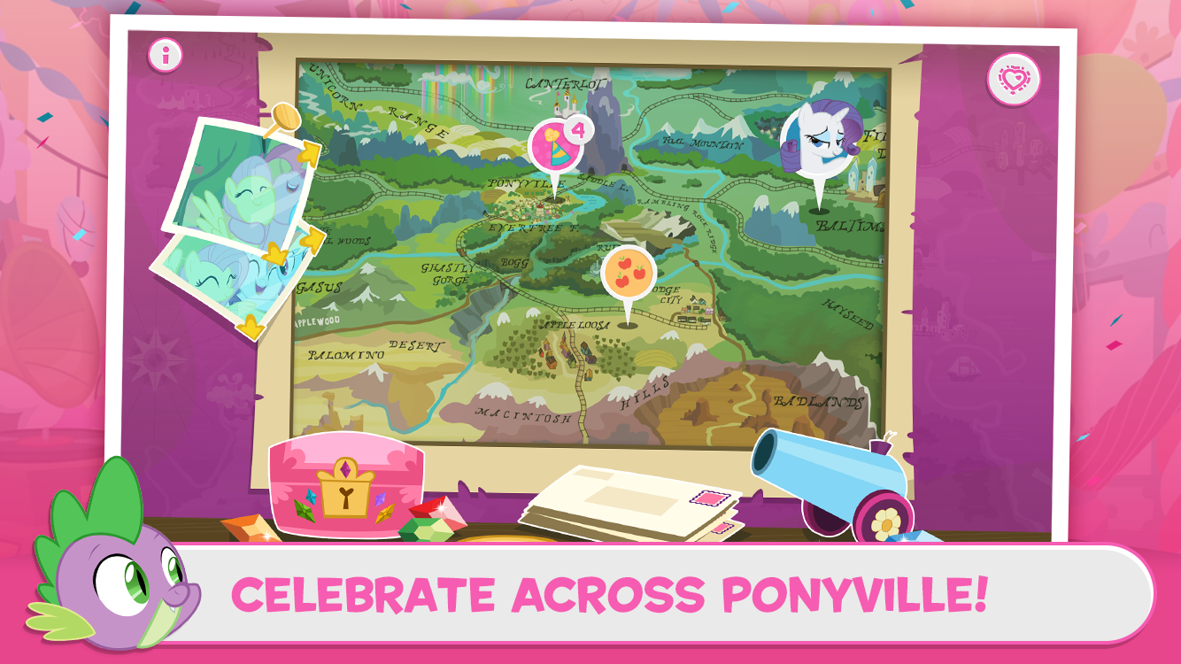 Bu Hasbro My Little Pony Dostluk Kutlama app Ponyville farklı bir parti günlük var! Davetler için posta kutunuzu kontrol edin ve sonra sanal çay partileri, oyunlar ve resimler için Prenses Twilight Sparkle, Rainbow Dash, Pinkie Pie ve diğer Midilli katılın!