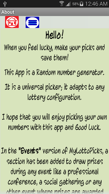 Bu MyLottoPicks bir "Olaylar" versiyonu, bir bölümü profesyonel bir konferansta, bir sosyal toplama veya ödül rastgele verilen herhangi başka bir olay gibi herhangi bir olay sırasında ödül çizmek eklendi.