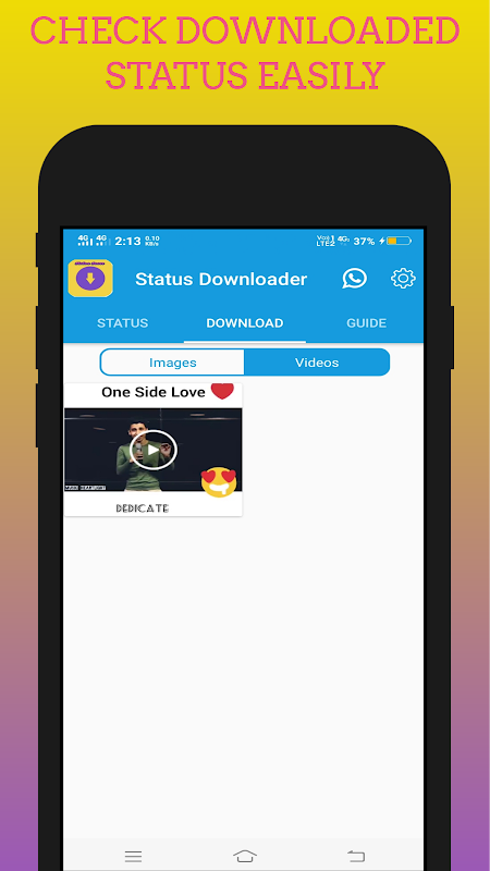 Download your WApp statuses by Status saver for WApp, Status Downloader allows you to download Images, videos and Gifs and sharing of these media while staying within status saver for WApp. You can save all the statuses at once by Download All features