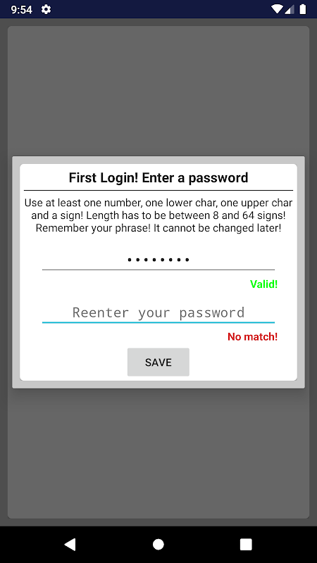 Wird die App pausiert, so wird nach 5min die Eingabe des Passworts gefordert, wenn man die Anwendung startet!