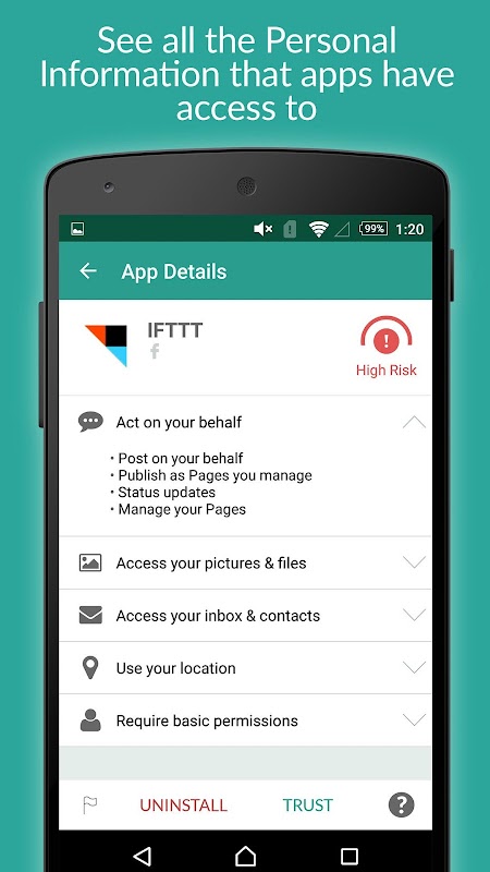 MyPermissions ile kişisel bilgilerinizi akıllıca yönetebilirsiniz! Sizin bilginiz olmadan fotoğraf, belge, konum bilgisi, rehber, e-posta ve diğer hassas bilgileri paylaşmaktan kaçının.