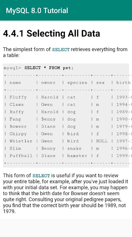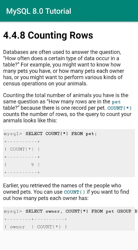 Ücretsiz, çevrimdışı, her zaman erişilebilir MySQL 8.0 Akıllı telefonunuz için öğretici.