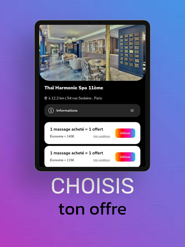 N'JOY, uygulamada listelenen tüm ortak kuruluşlarda binlerce "1 satın alma = 1 ücretsiz" teklifinden yararlanmanıza olanak tanır: restoranlar, sağlıklı yaşam enstitüleri ve hatta etkinlikler.