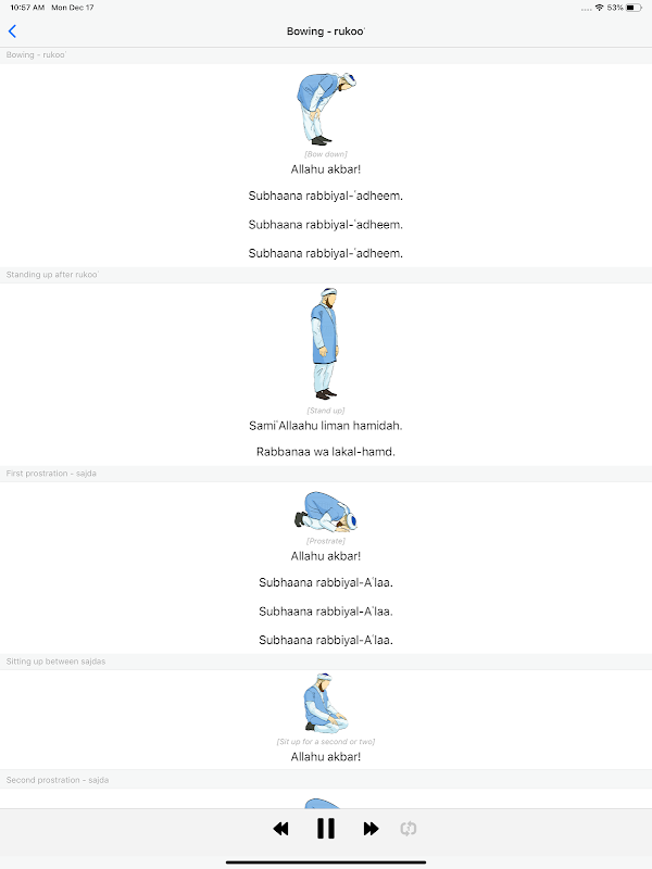 Arapça duaların doğru telaffuzunu dinlemek için bu uygulama bir ses çalar. Dua içinde okunan duaları ve Kuran bölümlerini öğrenmenize yardımcı olacaktır. Ayrıca, İngilizce harflerle çevrilmiş metinleri ve bu süreçte gezinmenize yardımcı olacak bazı çizimleri de bulacaksınız. Tüm içerik Hanafi hukuk fakültesi kurallarına uygundur.