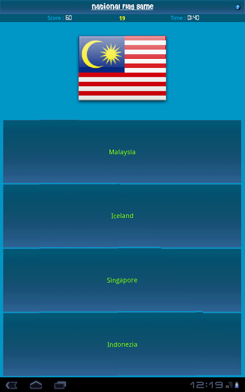 This is a simple national flags Game. It is a quiz in which you have to select correct name of given flag. It is fun and increases your general knowledge. So, try it and see how many questions can you answer ?