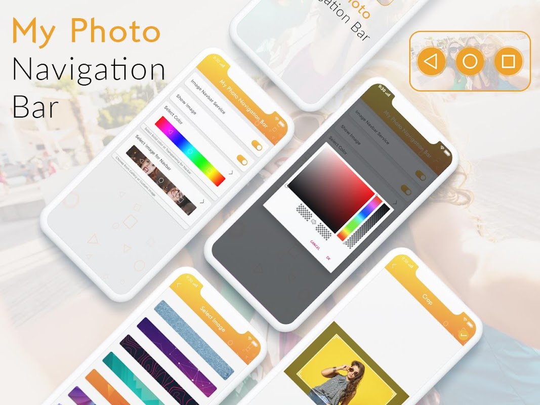 ♦ My Photo Navigation Bar is a personalization app that adds cool images, colors to your navigation bar which can be configured to make it your own. Choose from a wide variety of custom packs and never let your navigation bar be boring again!
