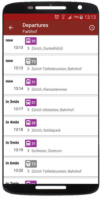 ► Sonraki seferler gerçek zamanlı olarak: İster Zürih'te, ister Cenevre'de, Basel'de, Lozan'da, Bern'de, Winterthur'da, Lucerne'de, St. Gallen'de olun. otobüs veya treninizi beklemeyin ve metro veya tramvay hareketinizi kaçırmayın. Tüm ulaşım ağlarınız için gerçek zamanlı bulun