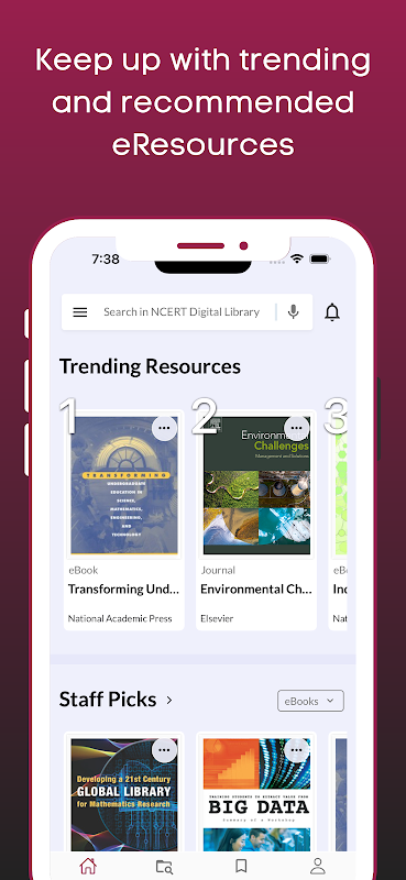 NCERT eKütüphanesi, geniş bir açık erişim koleksiyonu ve abone olunan e-Kaynaklar ve bilgi hizmetleriyle NCERT'te ve onu oluşturan enstitülerde çalışan tüm eğitimcilere ve personele hizmet vermektedir.